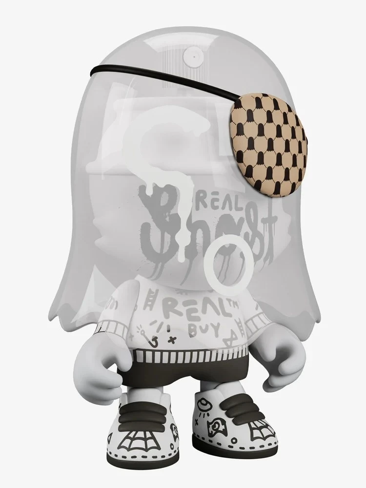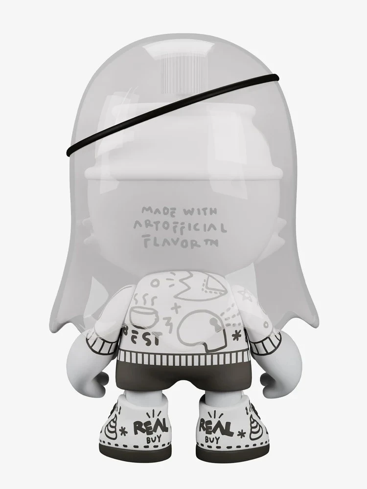 This 8-inch limited-edition vinyl art piece comes flawlessly finished in a muted matte colorway and features a removable semi-translucent ghost cloak, an electroplated chrome spray paint cap, and a customized luxury eye patch. Give Superghost a shake to activate the real rattle sound. Limited to only 2,500 ever made. Made with artofficial flavor