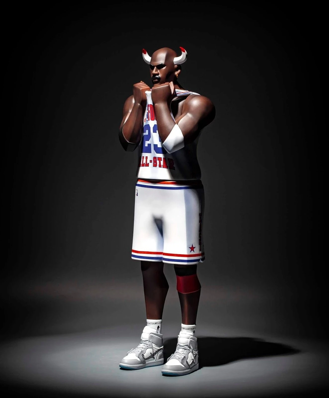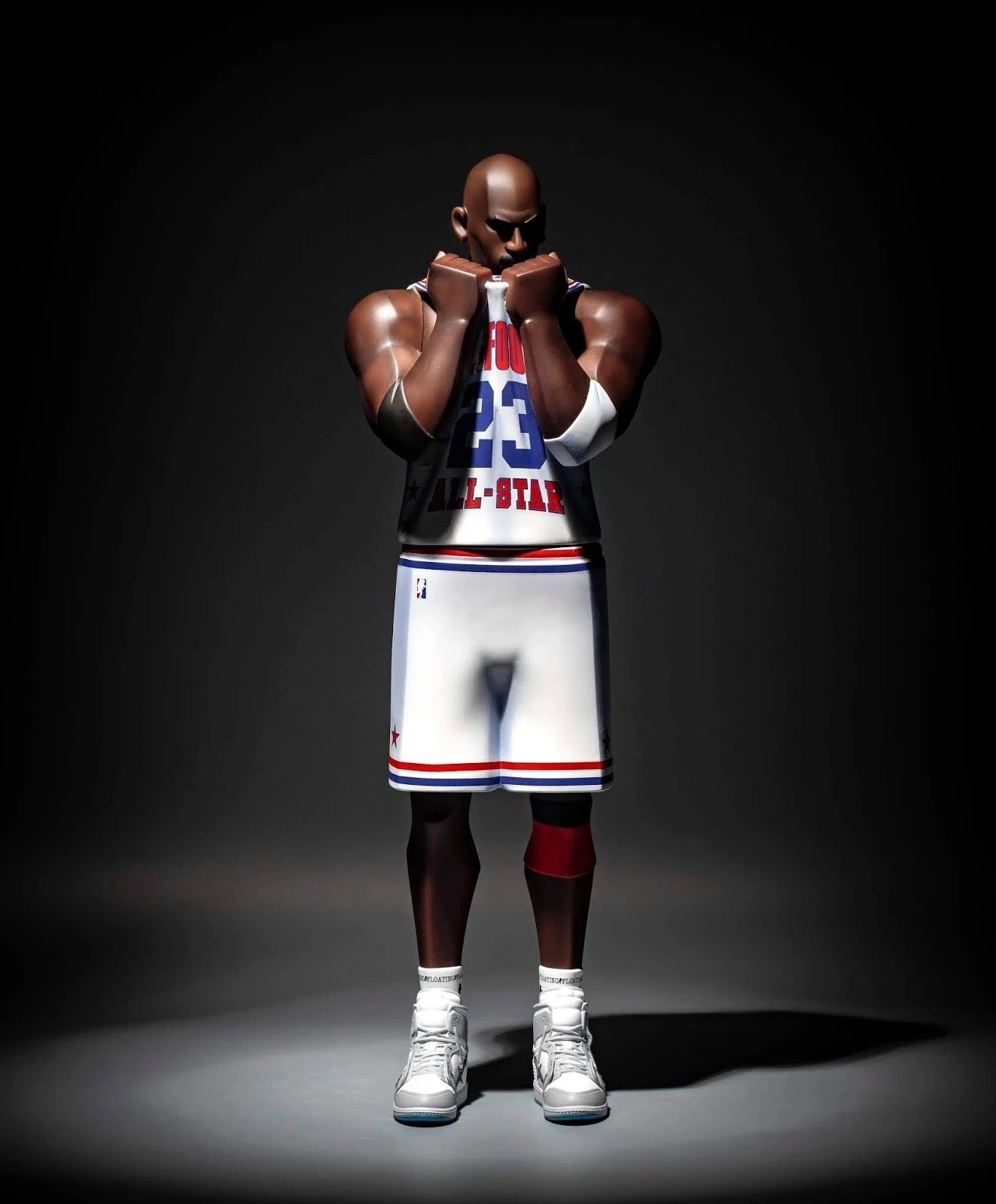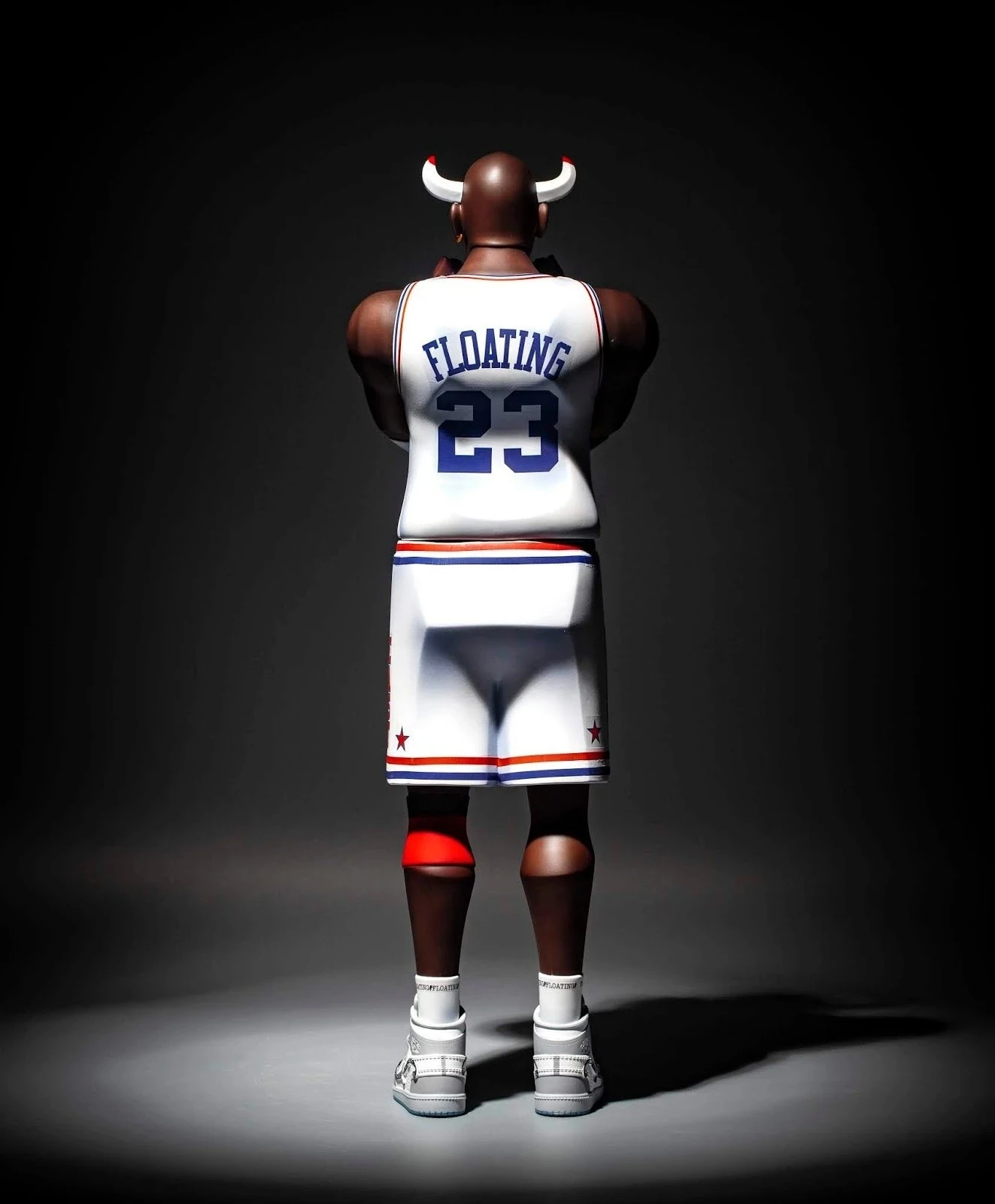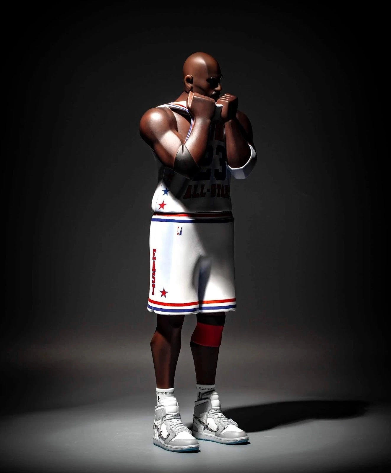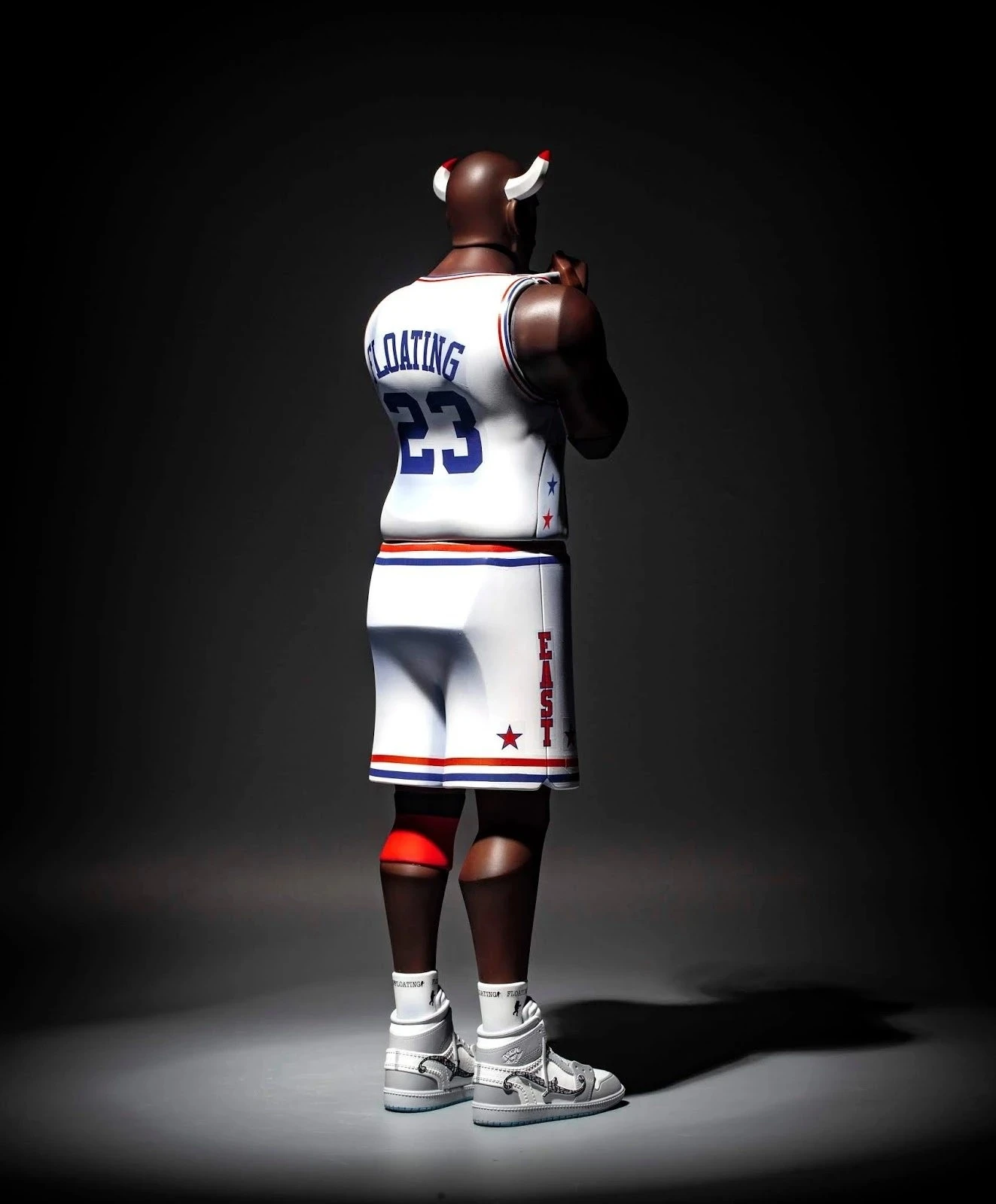 This is the third edition of Fools Paradise art take on the GOAT. This time, his Airness dons a tribute to the All-Star uniform inspired by the 92 Barcelona Games. This vinyl art toy stands at a towering 53 cm / 20.8″ inches tall!! That is HUGE!Â
