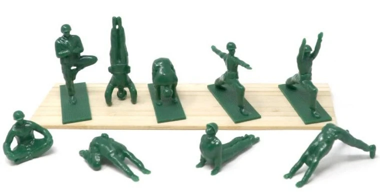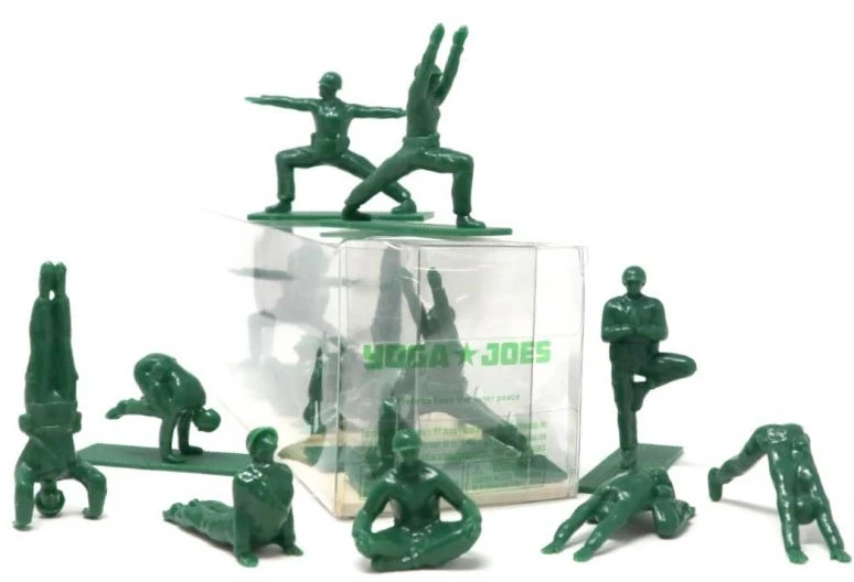 Our original set of Yoga Joes! Headstand, Meditation Pose, Cobra Pose, Warrior One, Warrior Two, Child’s Pose, Tree Pose, Crow Pose, and Downward-facing dog. Figures vary from 1″-3″ high, made from ABS plastic, and come in zen yoga studio packaging with a bamboo floor.